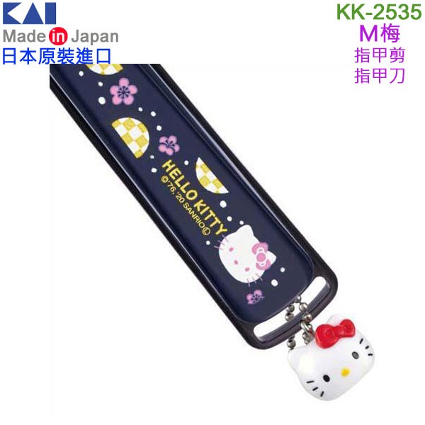日本製,日本貝印公司生產的指甲剪有鋒利的不鏽鋼刀片,帶有防止指甲屑飛濺的塞子外殼設計,採用抗菌素材,KK-2529 有可愛的HELLO KITTY圖案與與蝴蝶結和富士山和櫻花圖樣,KK-2531有可愛的HELLO KITTY圖案與蝴蝶結和糖果圖樣,KK-2533有可愛的HELLO KITTY圖案與花櫻圖樣,KK-2535有可愛的HELLO KITTY圖案與梅花圖樣。KK-2529、KK-2531款式有3D造型的蝴蝶結掛飾;KK-2533、KK-2535款式有3D造型的HELLO KITTY掛飾。