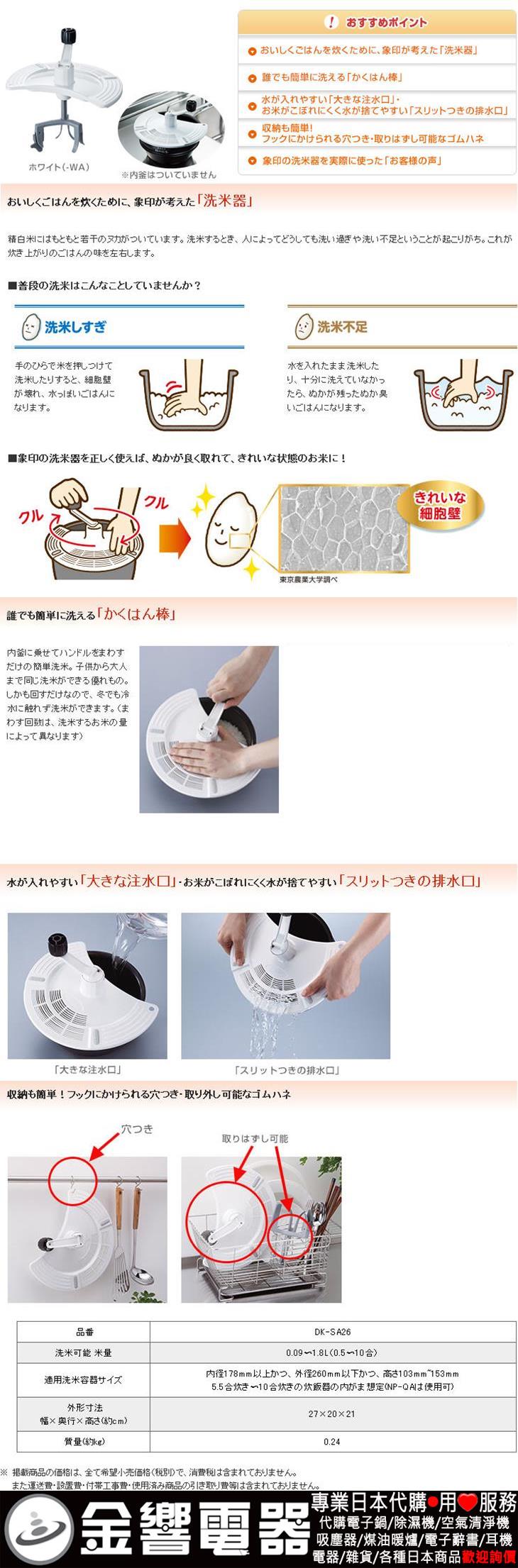 【金響電器】現貨,ZOJIRUSHI DK-SA26-WA(日本國內款):::象印洗米機,6~10份內鍋對應,刷卡或3期,DKSA26