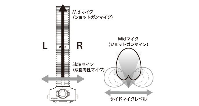 H5/H6/Q8用のオプションマイク・カプセル『SSH-6』は、センターの音を拾う超指向性のショットガンマイクと、左右の音を拾う双指向性のSideマイクを組み合わせたMS方式のステレオ・ショットガンマイクです。MSマイク『MSH-6』と同様に、Sideマイクのレベル(サイドマイクレベル)を調節することで、ステレオ幅を自在に変えることができます。「RAW」モードに設定すれば、録音後にステレオ幅を調節することも可能。ショットガンマイクで特定の音を狙い、後から必要に応じてSideマイクで拾った環境音を混ぜることができます。(※)