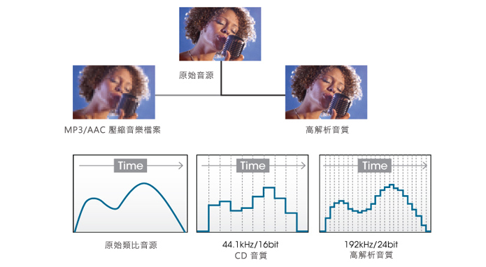 Hi-Resolution Audio 高解析音樂 是 Sony 對於最高聲音品質的新標準,這樣的音樂格式已經超越 CD 的音質表現。藉由具有再生高解析音樂能力的產品,即使播放的是 MP3 這種經過壓縮的音樂格式,同樣能發掘出聲音細節之美,並體驗到身歷其境的效果。了解更多>> |