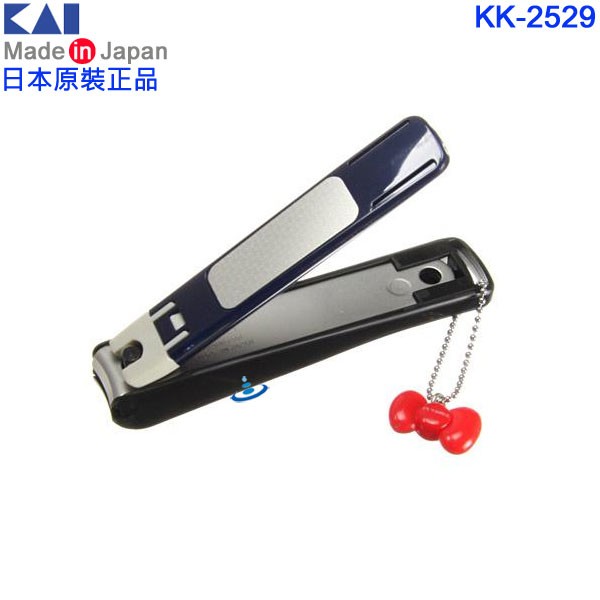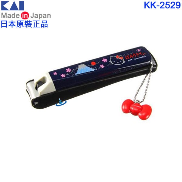 日本製,日本貝印公司生產的指甲剪有鋒利的不鏽鋼刀片,帶有防止指甲屑飛濺的塞子外殼設計,採用抗菌素材,KK-2529 有可愛的HELLO KITTY圖案與與蝴蝶結和富士山和櫻花圖樣,KK-2531有可愛的HELLO KITTY圖案與蝴蝶結和糖果圖樣,KK-2533有可愛的HELLO KITTY圖案與花櫻圖樣,KK-2535有可愛的HELLO KITTY圖案與梅花圖樣。KK-2529、KK-2531款式有3D造型的蝴蝶結掛飾;KK-2533、KK-2535款式有3D造型的HELLO KITTY掛飾。