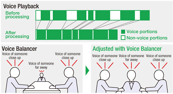 聲音平衡功能,可在大型會議錄音時,為了達到最佳錄音效果,此功能將自動調整及補償聲音信號誌最佳品質。