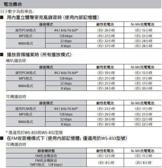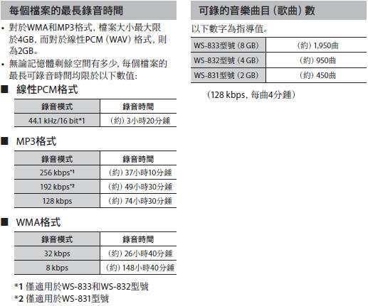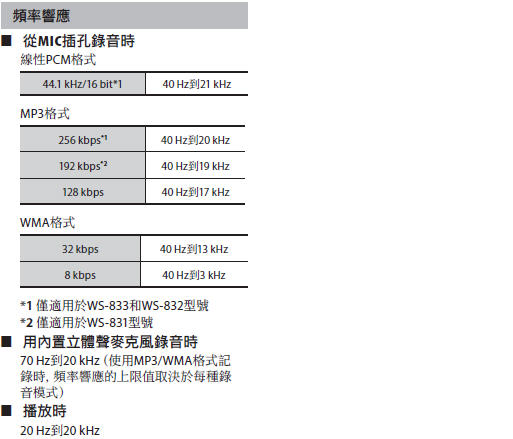 *1僅適於WS-833 和 WS-832