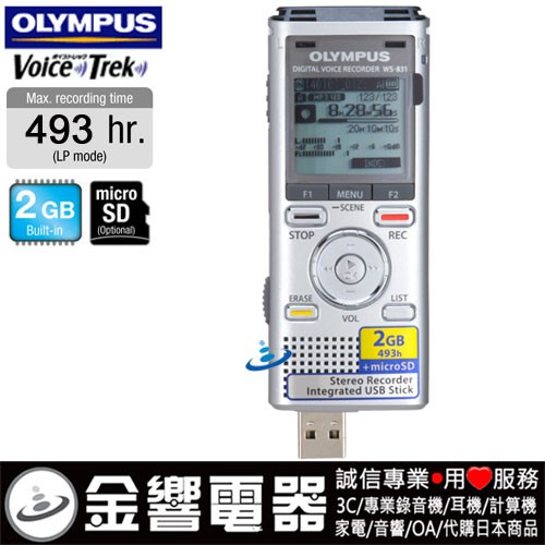 dot 金響電器‧金響日貨:::歡迎蒞臨金響門市參觀選購 EST.1995 » AV 機器 » 數位錄音機(筆) » 日本廠牌數位錄音機 » OLYMPUS數位錄音筆 » 客訂商品,OLYMPUS WS-831(公司貨):::數位錄音筆(內建2GB+micro SDHC對應),免運費,刷卡不加價或3期零利率,WS831