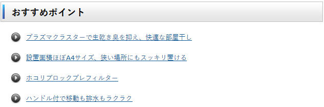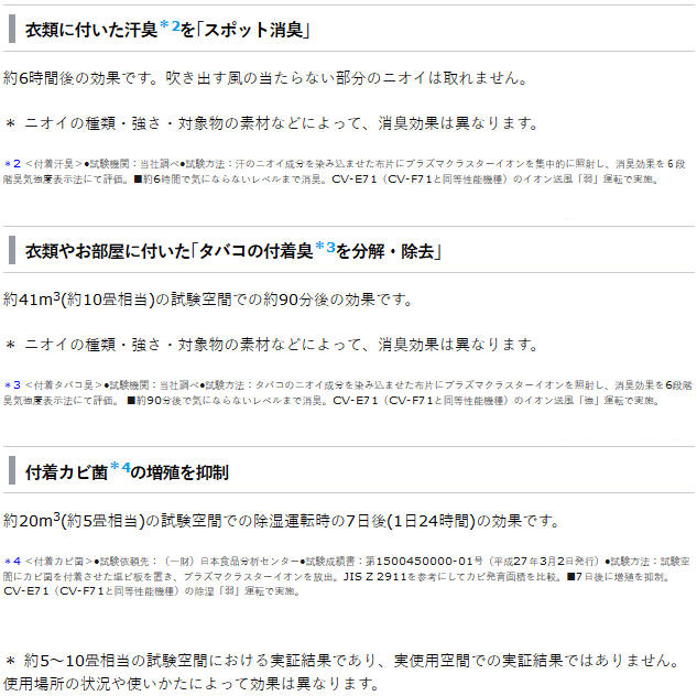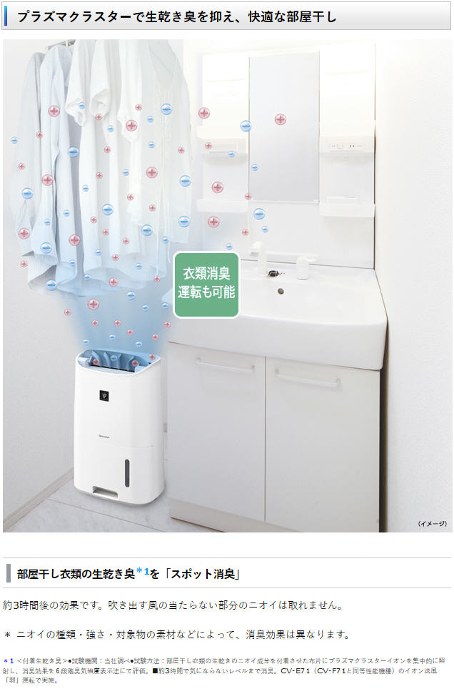 (注4) 除湿機の衣類乾燥性能は日本電機工業会自主基準(JEMA-HD090)に基づき、以下の条件のもとで試験を行った値です。試験条件●部屋の広さ6畳相当●室温20℃、湿度70%●洗濯物:2kg相当(Tシャツ3枚、Yシャツ2枚、パジャマ1組、下着7枚、靴下2足、タオル3枚)●運転モード:衣類乾燥「強」運転時、60Hz運転時。(実使用時の衣類乾燥時間は使用環境・使用条件により異なります。)