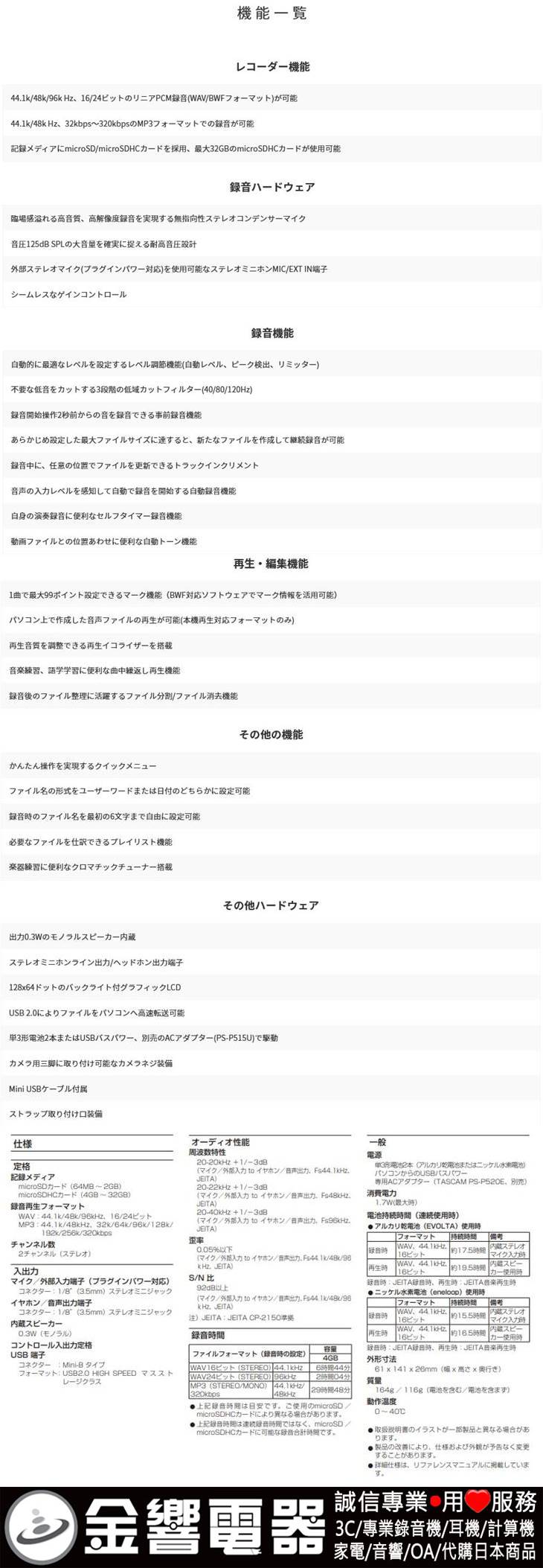 代購,TASCAM DR-05VER2-JJ(日本國內款):::24bit/96kHz PCM專業inear錄音機,microSDHC對應,刷卡或3期零利率,DR-05VER2JJ