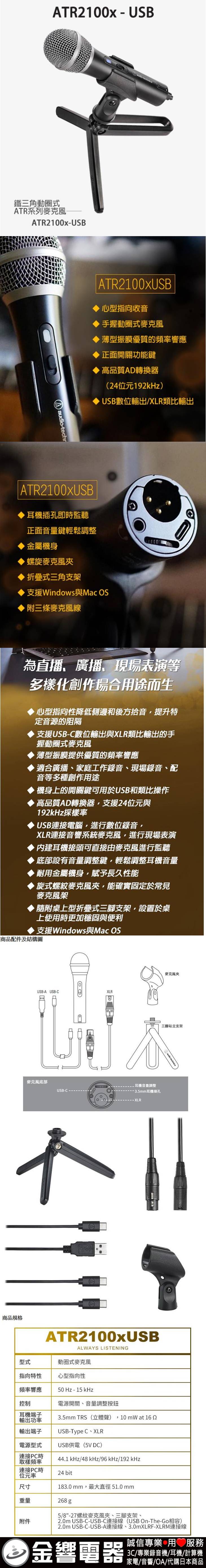 【金響電器】現貨, audio-technica ATR2100xUSB/ATR2100x-USB(公司貨):::心型指向性動圈USB/XLR麥克風