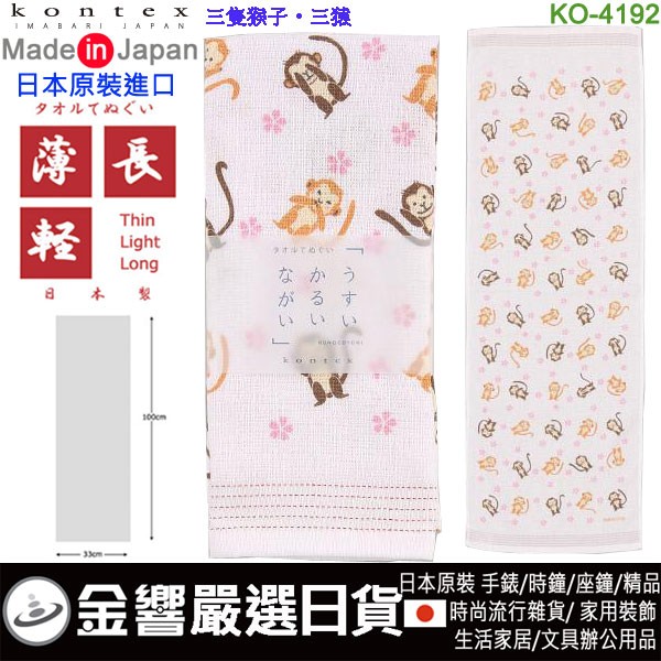 【金響日貨】kontex KO-4192 三隻猴子(日本原裝):::日本製,今治毛巾,純棉毛巾,洗臉巾,洗澡巾,紗布巾,長毛巾,刷卡或3期